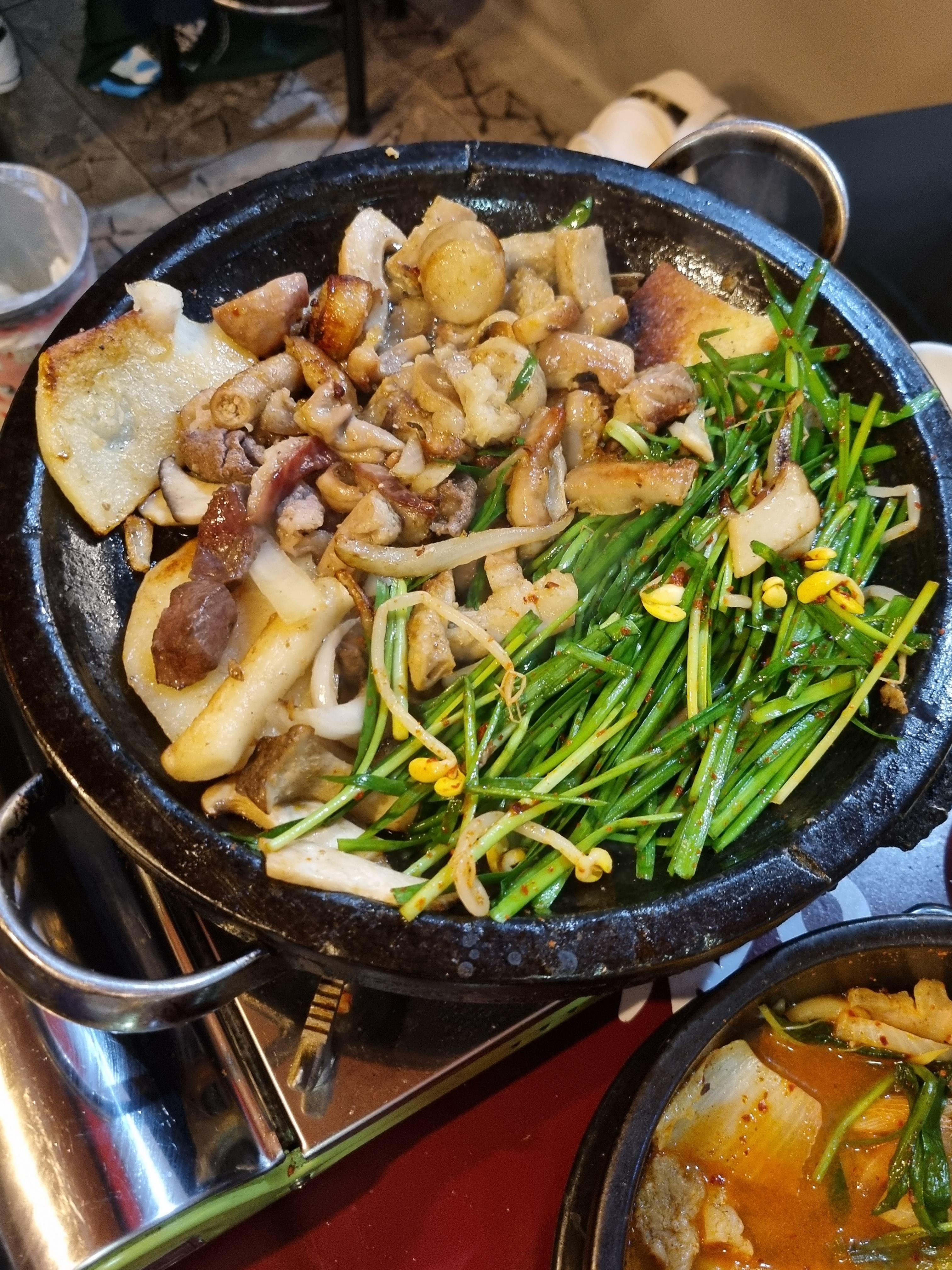 기름이 좀 많아지면 부추무침을 주시는데 그걸 철판 위에 올려서 먹으면 굉장히 맛있답니다.