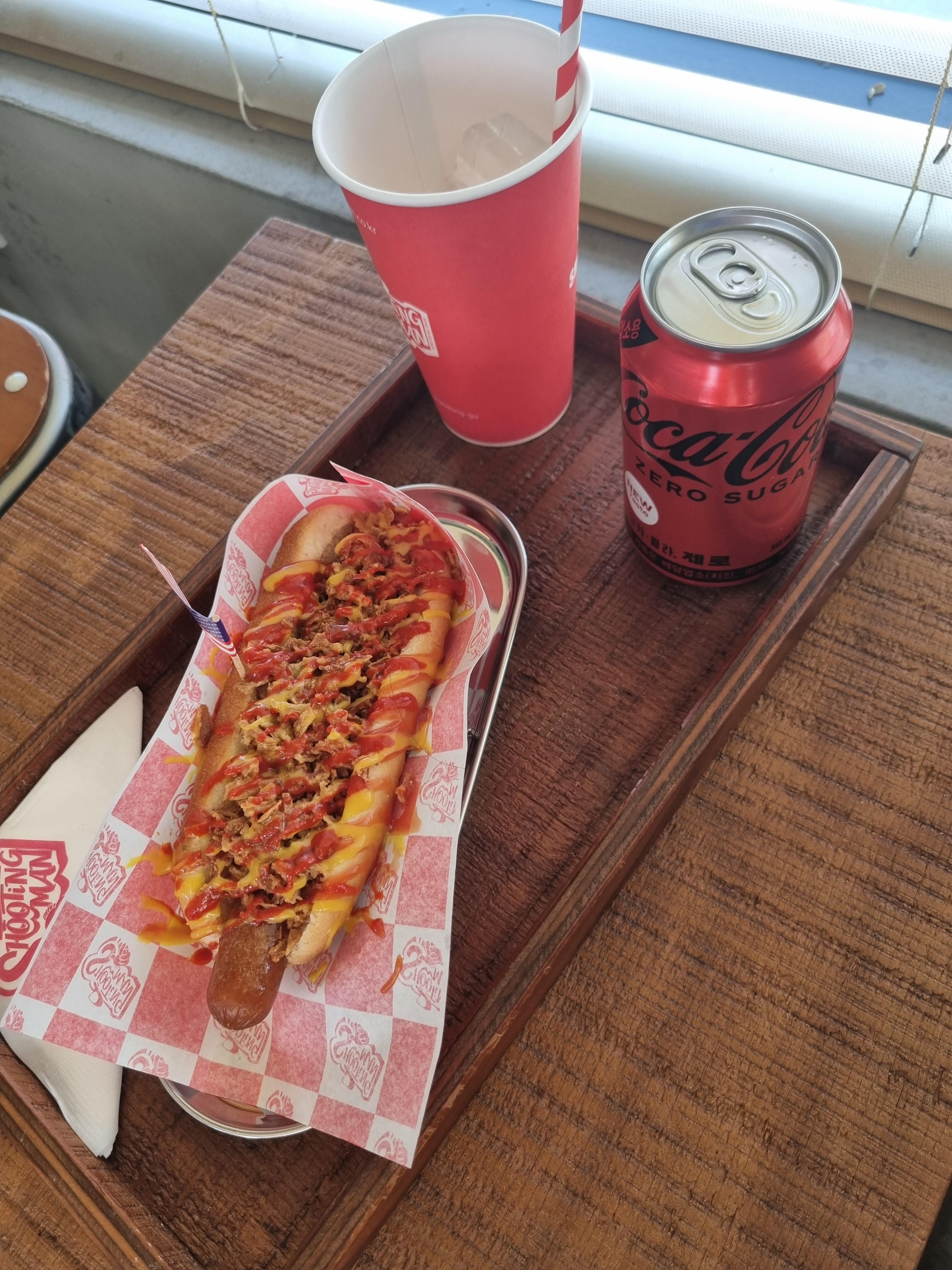 특유의 살사 소스와 마늘 후레이크가 어우러져 쫄깃한 핫도그 빵과의 조화가 굉장히 맛있었습니다.